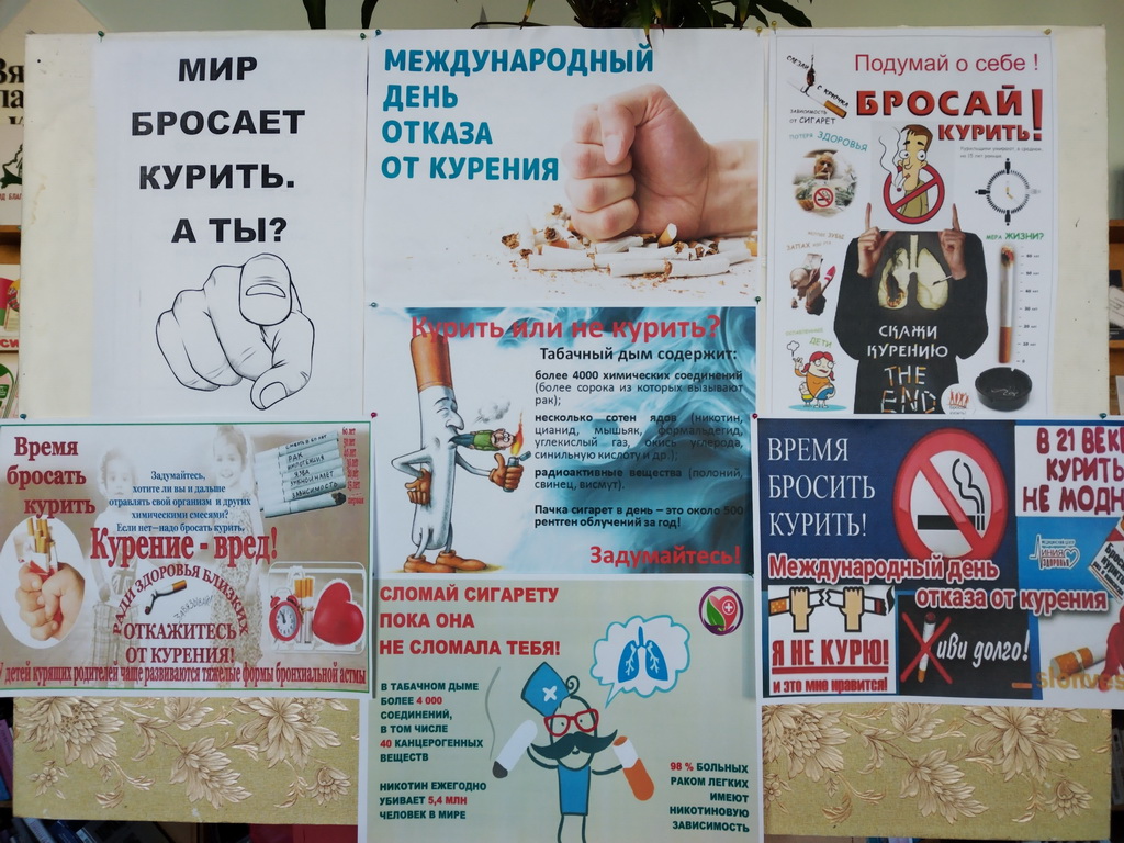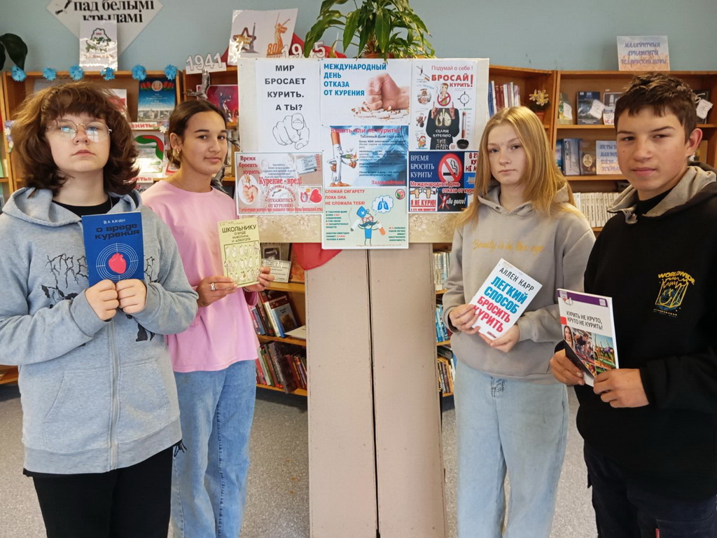 В рамках республиканской информационно-образовательной антиникотиновой акции ко Дню некурения в Катковской сельской библиотеке оформлена книжно-иллюстративная выставка «Мир бросает курить, а ты?» и состоялась беседа «Курение – зло», направленные на разъяснение вреда курения и последствий для здоровья. Большое внимание у ребят вызвала информация о заболеваниях, которые происходят с человеком в результате курения. Библиотекарь познакомила ребят с литературой о вреде табакокурения, а также порекомендовала альтернативы курению: заниматься спортом, путешествовать, читать книги, посещать различные кружки, подростковые клубы.