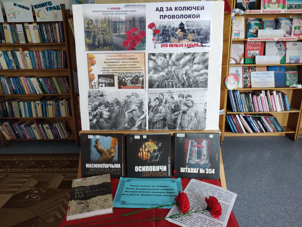 11 апреля в Заелицкой сельской библиотеке был проведен час истории «Ад за колючей проволокой». Участники мероприятия узнали об истории возникновения Международного дня освобождения узников фашистских концлагерей и событиях, предшествующих памятной дате. Страшные факты и цифры жертв лагерей смерти не оставили равнодушными никого из присутствующих. К мероприятию была подготовлена тематическая книжная выставка «Геноцид – трагедия белорусского народа». На выставке представлены книги о бесчинствах гитлеровцев в Тростенце, Осиповичах, Озаричах, Масюковщине и прочих печально известных концлагерях на территории оккупированной Беларуси.