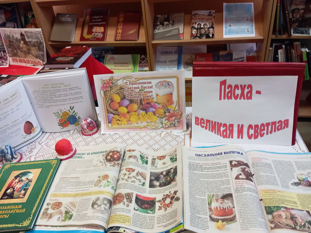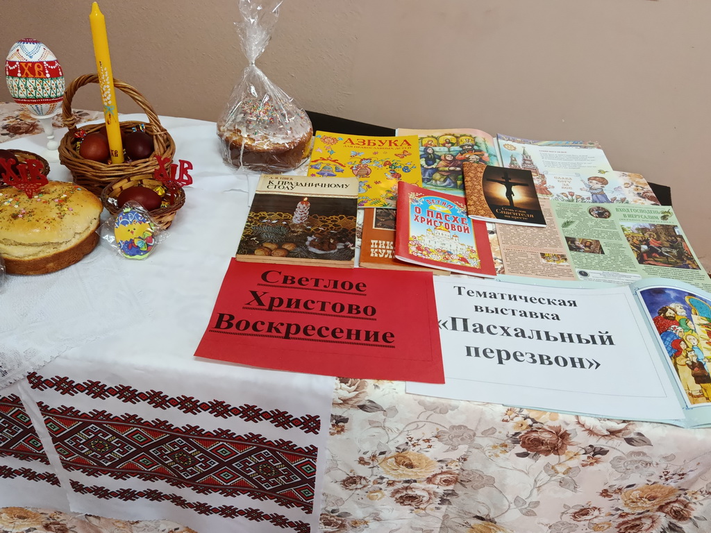 Накануне светлого праздника Пасхи в Бабировской библиотеке-клубе оформлена тематическая выставка «Пасхальный перезвон». Праздник праздников и Торжество торжеств – Светлое Христово Воскресение (Пасха). Это самый светлый и радостный праздник – праздник торжества Жизни. На выставке размещена информация о Страстной седмице и праздновании Пасхи, рецепты куличей и готовые куличи, пасхальные яйца и свечи.