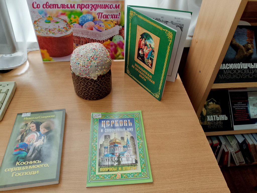 В Берёзовской сельской библиотеке оформлена тематическая выставка «Со светлым праздником Пасхи!». Посетителям библиотеки была представлена литература духовного содержания: «Коснись сердца моего, Господи», «Церковь и современный мир: вопросы и ответы», «Школьнікам аб праваслаўнай веры».