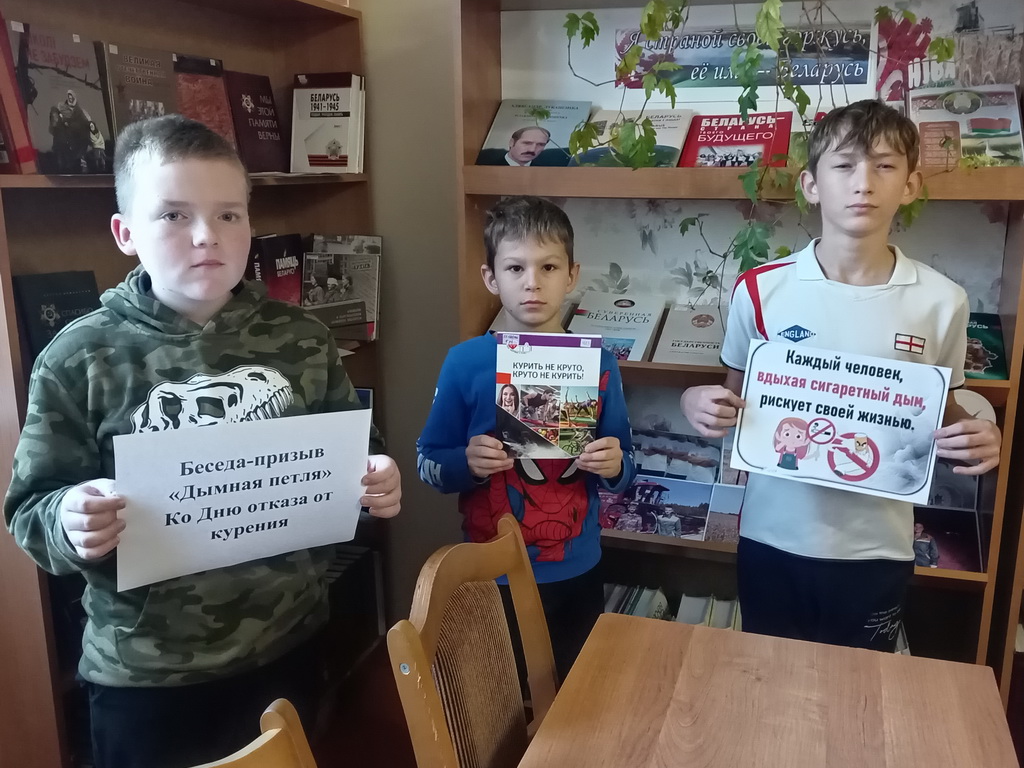 В Заелицкой сельской библиотеке для участников была проведена беседа-призыв «Дымная петля», в ходе которой библиотекарь рассказала детям о вреде и о последствиях курения, затем участники просмотрели информационные буклеты и литературу о пагубном влиянии табака на организм человека.