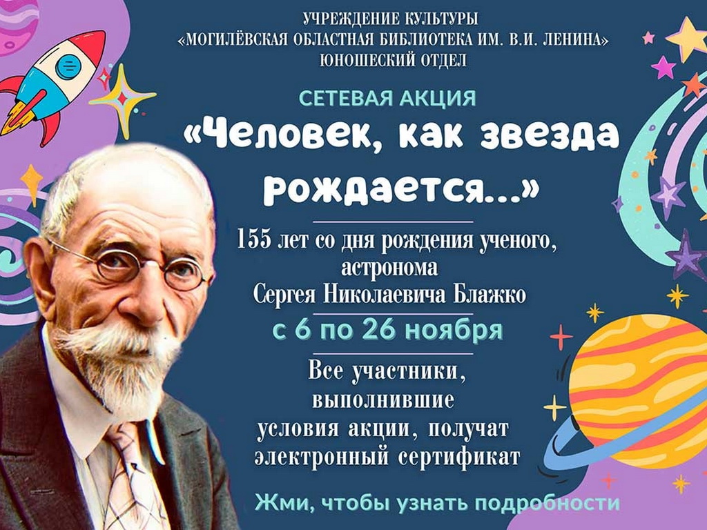 Библиотекарь Заволочицкой сельской библиотеки приняла участие в сетевой акции «Человек, как звезда, рождается…», посвящённой 155-летию со дня рождения учёного, астронома Сергея Николаевича Блажко, уроженца города Хотимска Могилёвской области. Организатор акции – юношеский отдел учреждения культуры «Могилёвская областная библиотека имени В.И.Ленина».