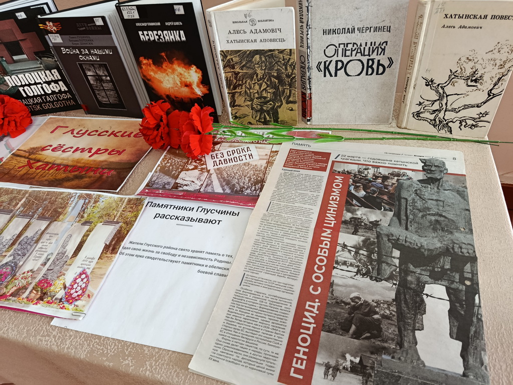 В Берёзовской сельской библиотеке был проведён час памяти «Они разделили участь Хатыни». Мероприятие было проведено среди 5 детей и подростков. Им напомнили о трагической дате 43 года, рассказали об истории Хатыни, показали репродукцию мемориального комплекса и предназначение каждого элемента. А также дети ознакомились с буклетом «Глускія сёстры Хатыні», подготовленным библиотекарем. В нём описаны деревни, которые были уничтожены фашистами вместе с их жителями.
