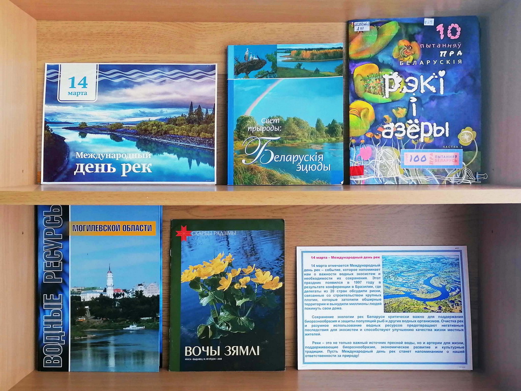 К Международному дню рек, который ежегодно отмечается 14 марта, в Заволочицкой сельской библиотеке оформлена тематическая полка, напоминающая о важности водных экосистем и необходимости их сохранения, об ответственности за природу. Реки – это не только важный источник пресной воды, но и артерии для жизни, поддерживающие биоразнообразие, экономическое развитие и культурные традиции.