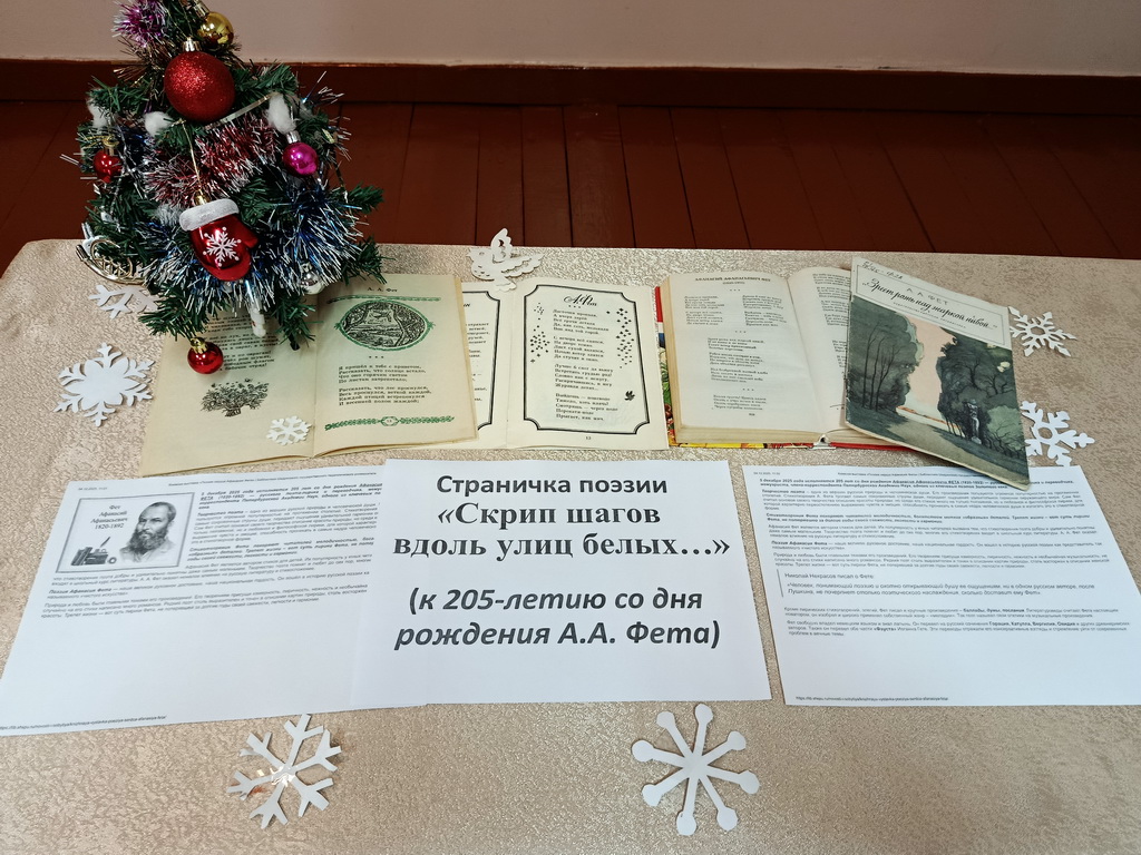 К 205-летию со дня рождения А.А.Фета в Бабировской сельской библиотеке-клубе оформлена страничка поэзии «Скрип шагов вдоль улиц белых…». Любовь и природа были главными темами его произведений. Его творениям присущи лиричность, нежность и необычайная музыкальность. Не случайно на его стихи написано много романсов. На выставке можно познакомиться со сборниками стихов «Зреет рожь над жаркой нивой…», «Приметы осени» и другими произведениями.