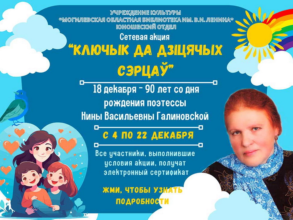 Сетевая акция «Ключык да дзіцячых сэрцаў», проходящая с 4 по 22 декабря, приурочена к 90-летию со дня рождения поэтессы Нины Васильевны Галиновской (1935–2025), уроженки деревни Большие Лозицы Шкловского района Могилевской области. Организатор акции – юношеский отдел учреждения культуры «Могилевская областная библиотека им. В.И.Ленина». Библиотекарь Заволочицкой сельской библиотеки приняла участие в акции, разместив на личной странице социальной сети «ВКонтакте» пост, содержащий отрывок из произведения Нины Васильевны Галиновской.