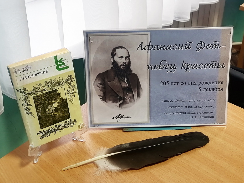 Афанасий Фет – один из первых русских лириков. Его поэтическая, «фетовская» манера письма придавала его поэзии неповторимые оттенки. Он воспевал «красоту мира, красоту жизни и любви». 5 декабря поэту исполняется 205 лет со дня рождения, в честь чего в Заволочицкой сельской библиотеке оформлена тематическая полка «Афанасий Фет – певец красоты».